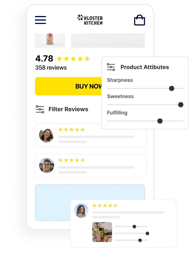 Showcase key parts of reviews in a dynamic carousel on your homepage, checkout, and product pages to increase conversion rate. Review nuggets help to display authentic and valuable review content that highlights purchase sentiment in the right place to improve trust and engagement.
